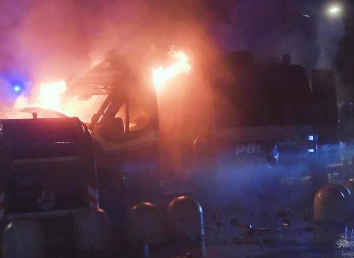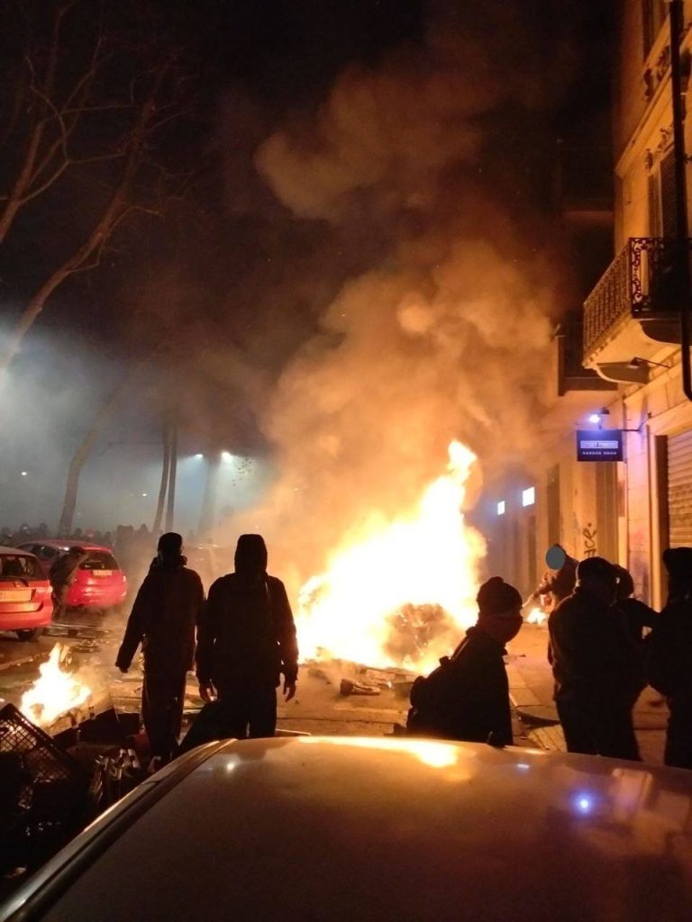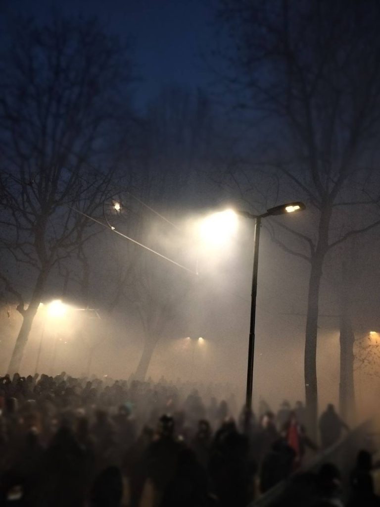 Qui i manifestanti sono stati raggiunti da un fitto lancio di lacrimogeni. La testa del corteo ha reagito con il lancio di petardi e fuochi d’artificio, mantenendo la posizione, fronteggiando un ingente schieramento di forze dell’ordine. I manifestanti hanno poi respinto le cariche della polizia e l’avanzata di una dozzina di mezzi blindati.