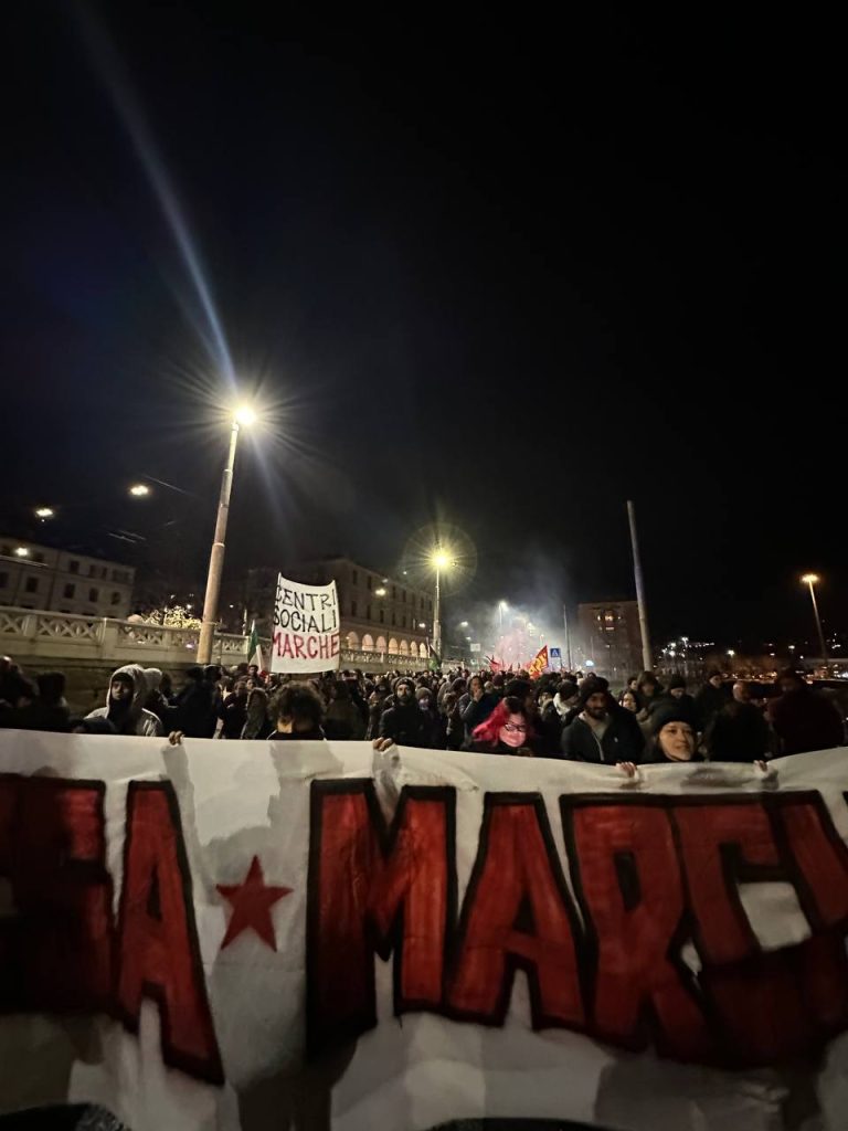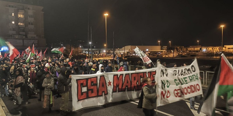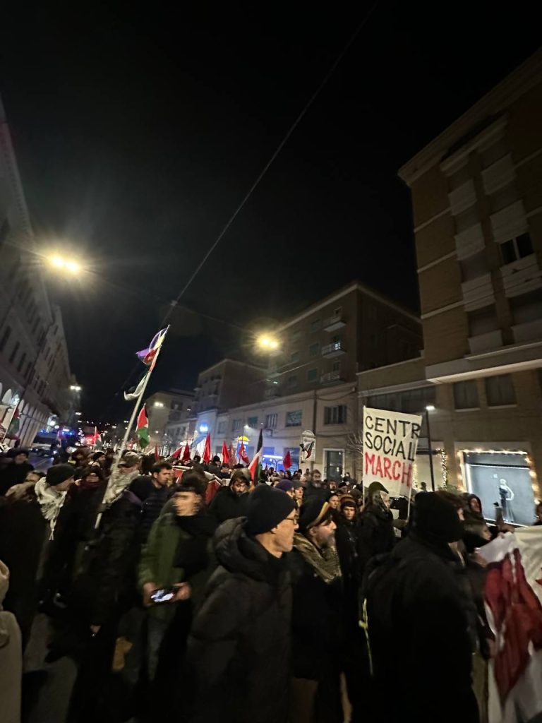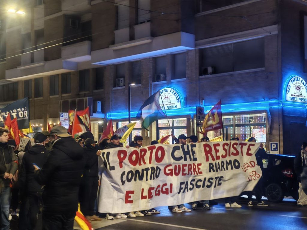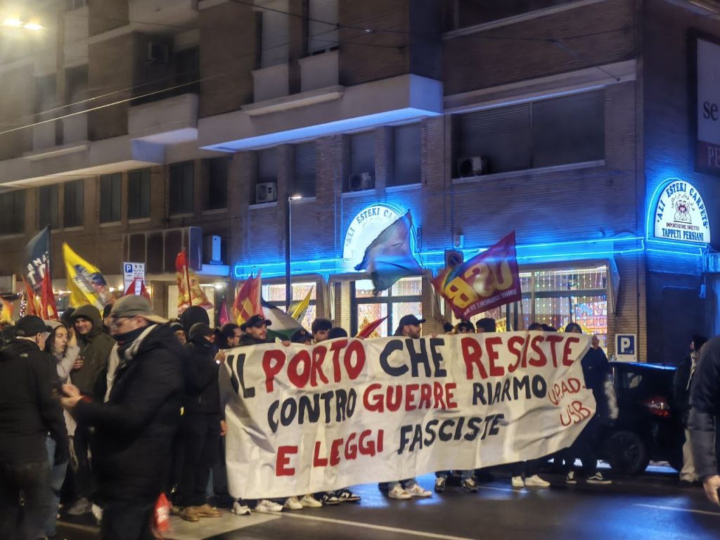 Un migliaio di persone ha attraversato il porto di Ancona in corteo, riappropriandosi di un’area blindata e sottratta alla città. Un risultato importante e significativo, oltre ogni retorica. Una piazza che ha visto una presenza giovanile e studentesca di rilievo al fianco delle realtà sociali e politiche della regione. Una mobilitazione in piena continuità con le lotte che nelle ultime settimane e negli ultimi giorni stanno attraversando il nostro paese e che parla direttamente al governo e ai suoi tentativi sistematici di chiudere ogni spazio di agibilità politica e sociale ai movimenti e alla loro capacità autonoma di lottare e non di testimoniare, di sabotare gli ingranaggi della guerra e non di essere spettatori passivi.