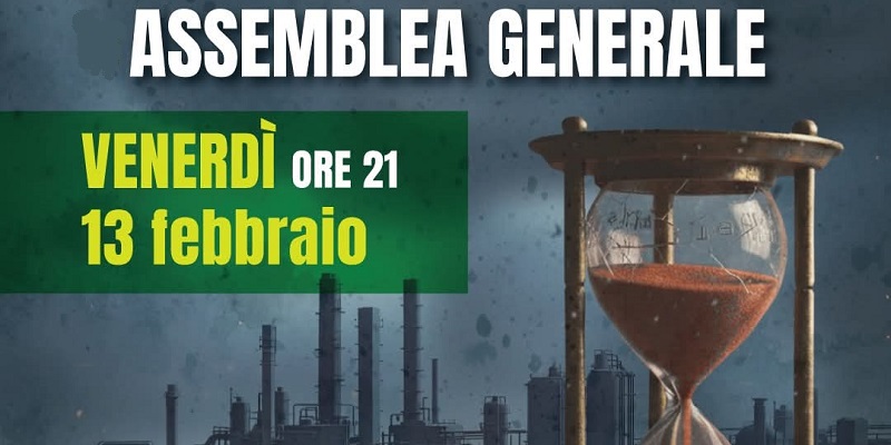 Non c’è più tempo, il momento è ora. Ci vediamo venerdì prossimo 13 febbraio alle 21 alla Galleria delle idee in assemblea generale, in forma urgente e necessaria, per decidere insieme le prossime iniziative e mobilitazioni. Urgente, visto il contesto territoriale fatto di reiterate emergenze, o episodi di “maggiore visibilità della torcia”, continue segnalazioni di esalazioni nocive provenienti dalle troppe fonti inquinanti che circondano questo territorio, mentre continua il processo per disastro ambientale ed altri reati.