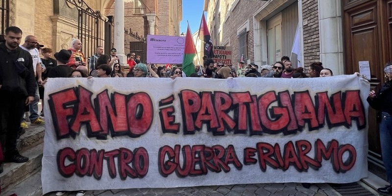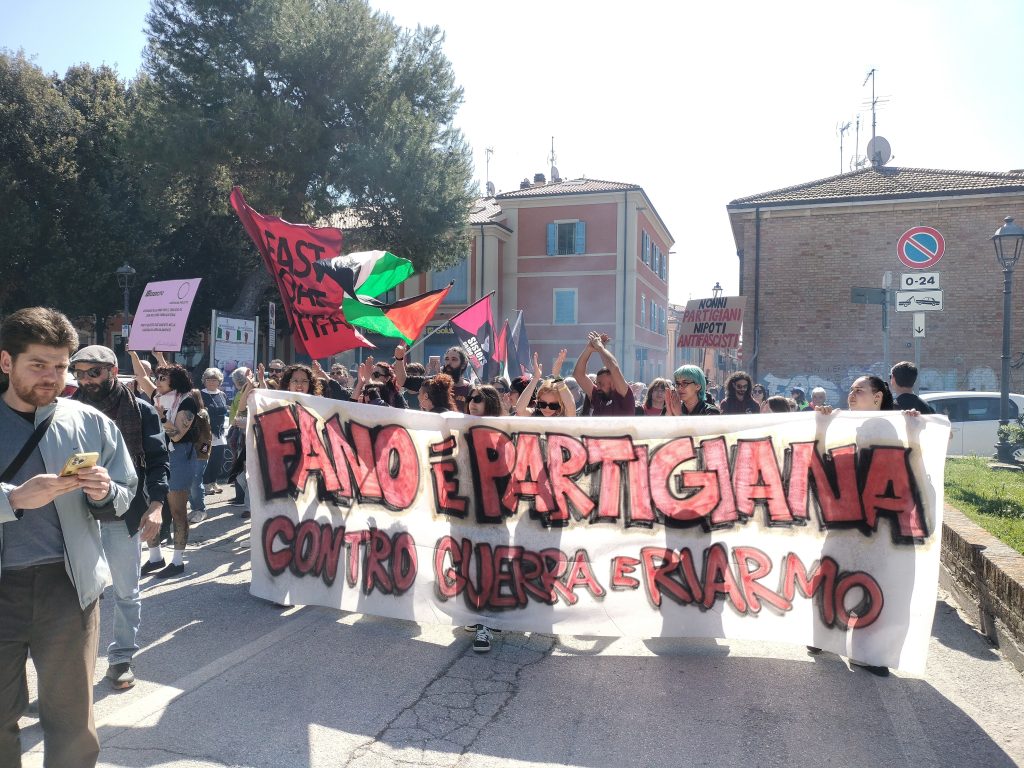 Le strade di Fano si sono riempite di centinaia e centinaia di persone, tutte riunite dietro allo striscione “Fano è Partigiana! Contro guerra e riarmo”. Sotto al comune, punto di partenza del corteo, la parte istituzionale, dai numeri miseri e che da sempre vive la giornata come un momento dovuto da far durare il meno possibile, ha tentato di schierare la polizia per tenere alla larga il corteo vero, lo spezzone sociale fatto di uomini e donne, studenti e studentesse: tentativo andato a vuoto.