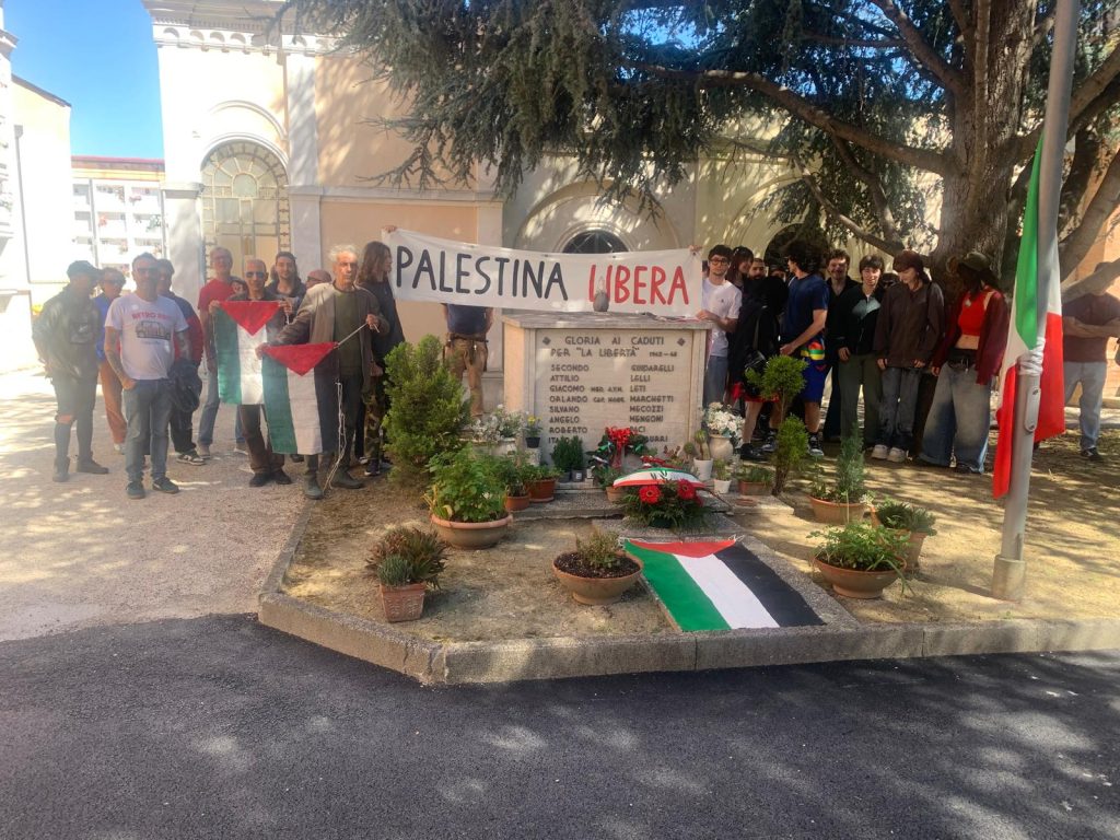 A Civitanova Marche l’Officina Popolare Jolly Roger ha convocato la commemorazione al cimitero comunale; oltre ai fazzoletti rossi, bandiere della Palestina e un drappo “Palestina libera”, a ribadire come quei valori di libertà e autodeterminazione vivano oggi nelle esperienze di resistenza in Asia occidentale.