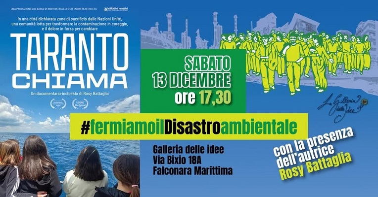 Sabato 13 dicembre ore 17:30 invitiamo ad essere presenti alla Galleria delle Idee Falconara per un incontro pubblico davvero speciale e la proiezione di “Taranto Chiama”. Avremo infatti ospite Rosy Battaglia, regista del film e reporter indipendente.